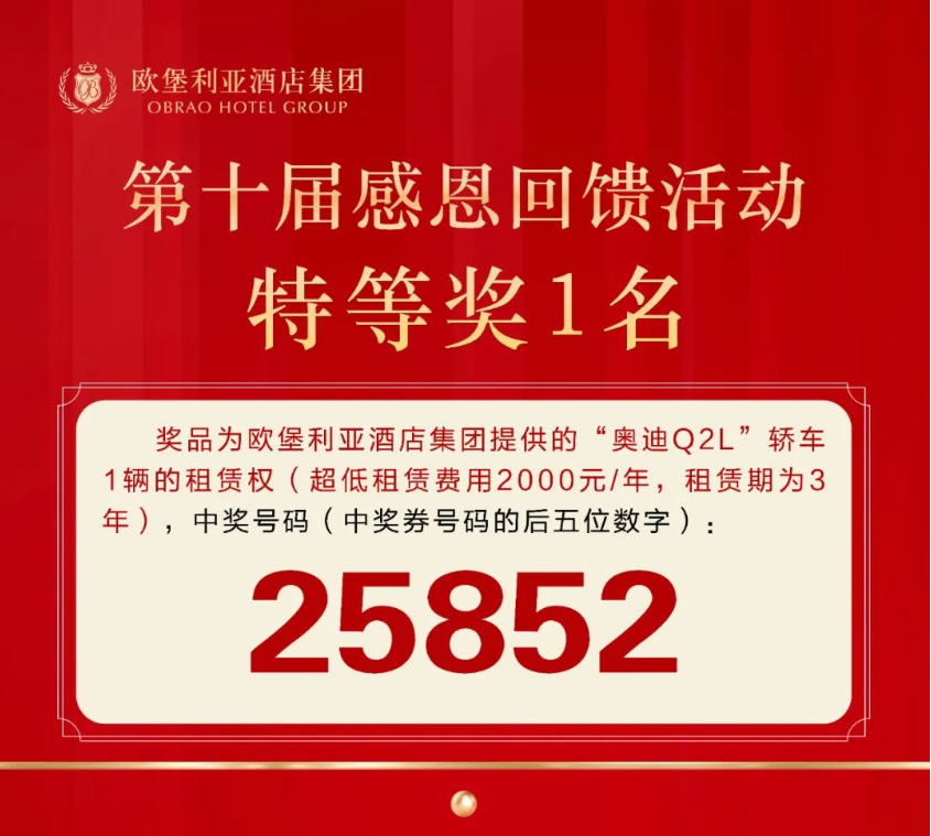 ▲歐堡利亞酒店集團第十屆感恩回饋活動特等獎中獎號碼